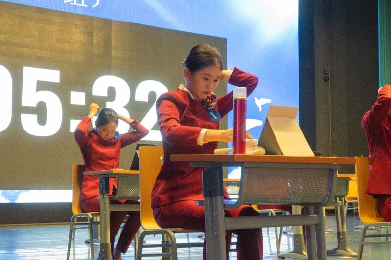 参赛学生神情专注、动作娴熟,在规定时间内有条不紊地完成各项操作:整洁利落的发髻彰显着乘务人员的干练形象,造型规范、美观大方的领花传递着航空服务的礼仪温度,松紧适度、系法标准的领带展现着职业人的严谨态度。每一个精准的动作、每一处细节的把控,都是学子们将思政要求内化于心、外化于行的生动体现,更是对“细节决定成败,专业成就未来” 职业理念的践行。