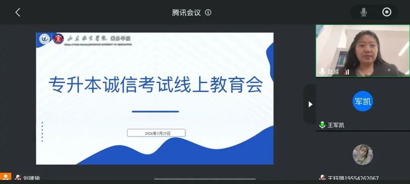 3月25日,乘务学院召开专升本诚信考试线上教育会,辅导员赵越主持会议,全体专升本备考学生参加。会上,赵越结合民航行业对诚信操守的标准要求,详细解读了专升本考试的规章制度,并通过典型违纪案例警示全体备考学生。她强调,专升本既是升学追梦的关键节点,更是锤炼个人品德的重要试炼,学生们要坚守诚信底线,自觉维护考试公平与职业尊严。本次专升本线上诚信教育会进一步将诚信教育与民航职业素养深度融合,筑牢学子诚信根基。